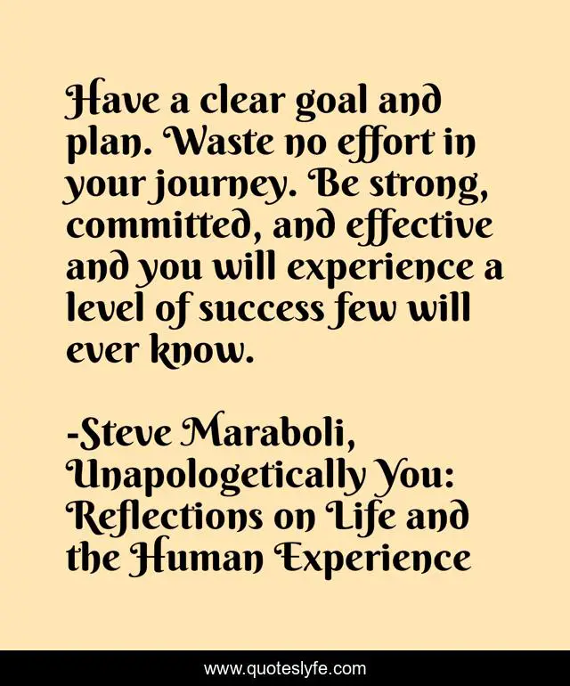 This page presents the quote "Have a clear goal and plan. Waste no effort in your journey. Be strong, committed, and effective and you will experience a level of success few will ever know.". Author of this quote is Steve Maraboli, Unapologetically You: Reflections on Life and the Human Experience. This quote is about action, goal, success, plan,.