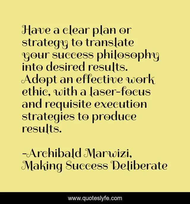 This page presents the quote "Have a clear plan or strategy to translate your success philosophy into desired results. Adopt an effective work ethic, with a laser-focus and requisite execution strategies to produce results.". Author of this quote is Archibald Marwizi, Making Success Deliberate. This quote is about life, success, behaviour, attitude, legacy, growth, purpose, inspirational, leadership,.