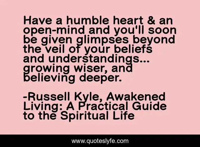 This page presents the quote "Have a humble heart & an open-mind and you'll soon be given glimpses beyond the veil of your beliefs and understandings... growing wiser, and believing deeper.". Author of this quote is Russell Kyle, Awakened Living: A Practical Guide to the Spiritual Life. This quote is about open-mindedness, spiritual, beliefs, wisdom,.