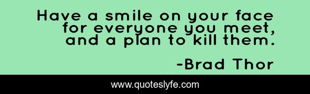 This page presents the quote "Have a smile on your face for everyone you meet, and a plan to kill them.". Author of this quote is Brad Thor. This quote is about humor, political, thriller, fiction,.