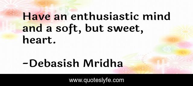 This page presents the quote "Have an enthusiastic mind and a soft, but sweet, heart.". Author of this quote is Debasish Mridha. This quote is about life, love, knowledge, inspirational, intelligence, philosophy, wisdom, quotes, affection,.