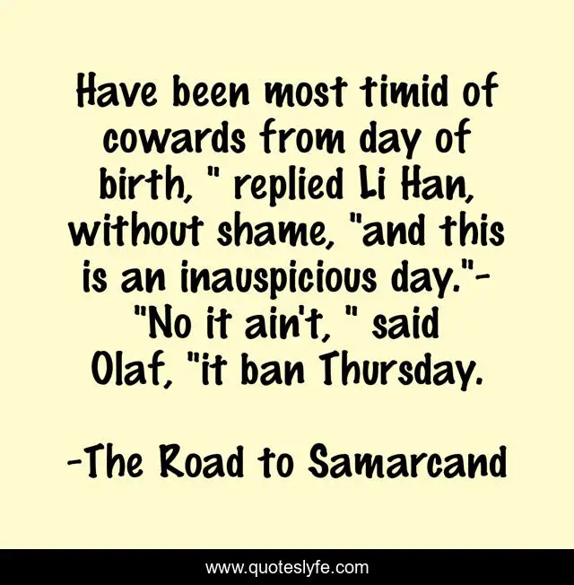 This page presents the quote "Have been most timid of cowards from day of birth, " replied Li Han, without shame, "and this is an inauspicious day."- "No it ain't, " said Olaf, "it ban Thursday.". Author of this quote is The Road to Samarcand. This quote is about swedish, olaf, samarkand, samarcand, fiction, o-brian, china, inspirational, enthusiasm,.