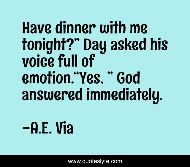 This page presents the quote "Have dinner with me tonight?” Day asked his voice full of emotion.“Yes, ” God answered immediately.". Author of this quote is A.E. Via. This quote is about date, god, day,.