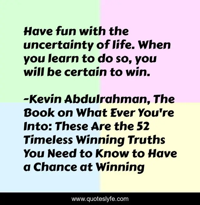 This page presents the quote "Have fun with the uncertainty of life. When you learn to do so, you will be certain to win.". Author of this quote is Kevin Abdulrahman, The Book on What Ever You're Into: These Are the 52 Timeless Winning Truths You Need to Know to Have a Chance at Winning. This quote is about life, life-lessons,.