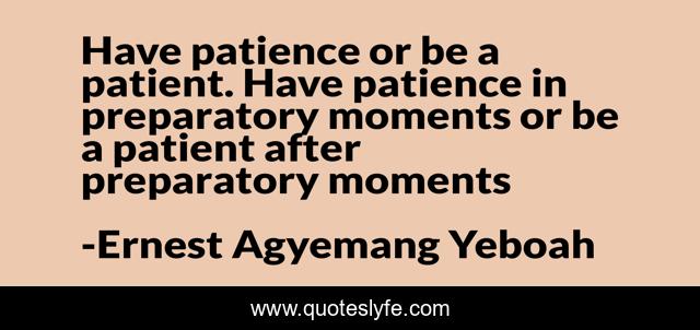 This page presents the quote "Have patience or be a patient. Have patience in preparatory moments or be a patient after preparatory moments". Author of this quote is Ernest Agyemang Yeboah. This quote is about love, patience-and-timing, love-and-saying, wisdom, patience, suffering, patience-and-criticism, inspirational, patience-and-love,.