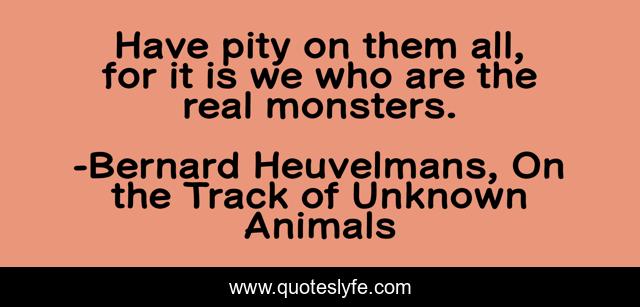 This page presents the quote "Have pity on them all, for it is we who are the real monsters.". Author of this quote is Bernard Heuvelmans, On the Track of Unknown Animals. This quote is about zoology, science, cryptozoology, animals, unknown,.