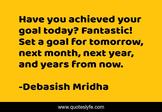 This page presents the quote "Have you achieved your goal today? Fantastic! Set a goal for tomorrow, next month, next year, and years from now.". Author of this quote is Debasish Mridha. This quote is about life, love, knowledge, inspirational, intelligence, philosophy, wisdom, quotes, affection,.