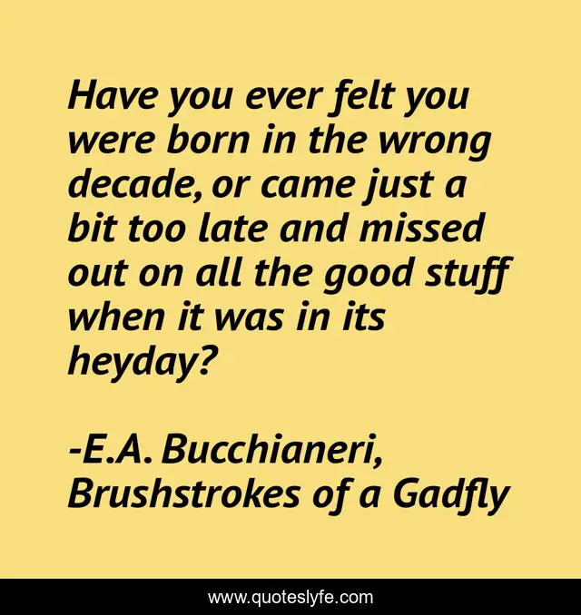 This page presents the quote "Have you ever felt you were born in the wrong decade, or came just a bit too late and missed out on all the good stuff when it was in its heyday?". Author of this quote is E.A. Bucchianeri, Brushstrokes of a Gadfly. This quote is about too-late, classic-times, looking-back, past-times, born-in-the-wrong-time, classics, history,.
