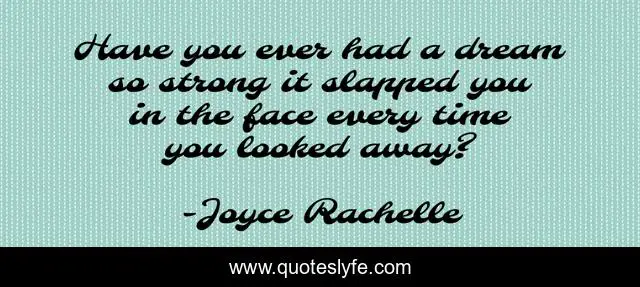 This page presents the quote "Have you ever had a dream so strong it slapped you in the face every time you looked away?". Author of this quote is Joyce Rachelle. This quote is about dream-big, big-dreams, distracted, slap, dreaming, ambition, dream, distraction,.