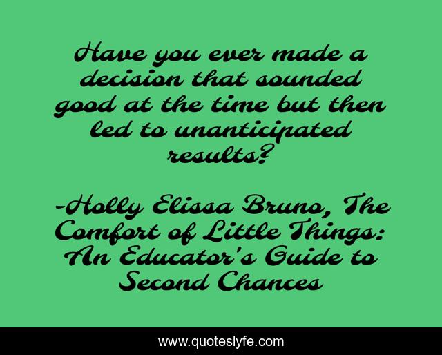 This page presents the quote "Have you ever made a decision that sounded good at the time but then led to unanticipated results?". Author of this quote is Holly Elissa Bruno, The Comfort of Little Things: An Educator's Guide to Second Chances. This quote is about education-leadership, 2nd-chances, forgiveness,.