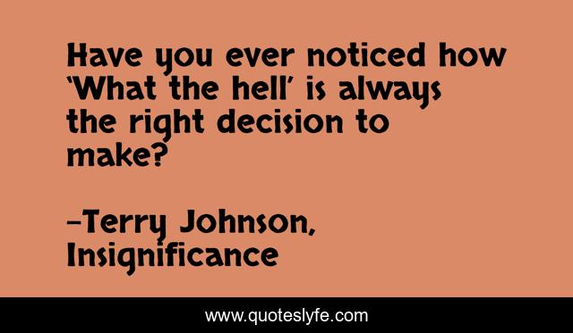 This page presents the quote "Have you ever noticed how ‘What the hell’ is always the right decision to make?". Author of this quote is Terry Johnson, Insignificance. This quote is about philosophy, humor, misattributed-to-marilyn-monroe,.