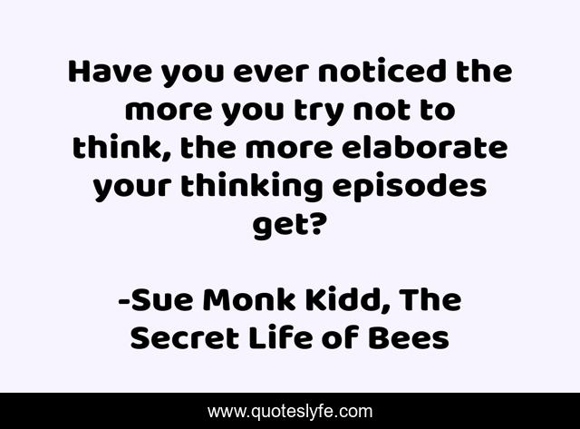 This page presents the quote "Have you ever noticed the more you try not to think, the more elaborate your thinking episodes get?". Author of this quote is Sue Monk Kidd, The Secret Life of Bees. .