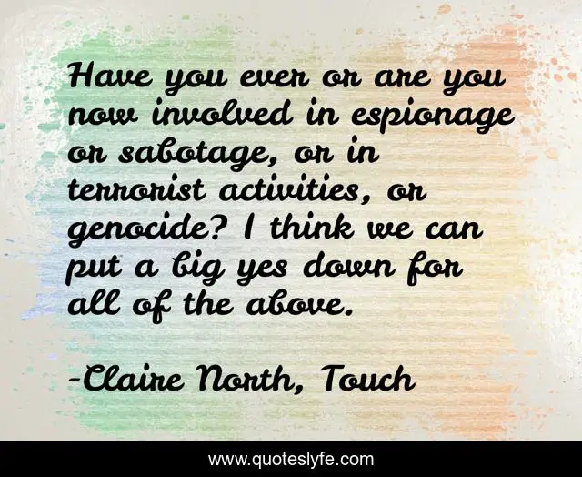 This page presents the quote "Have you ever or are you now involved in espionage or sabotage, or in terrorist activities, or genocide? I think we can put a big yes down for all of the above.". Author of this quote is Claire North, Touch. This quote is about ghost, funny, airport, kepler, security, comedy,.