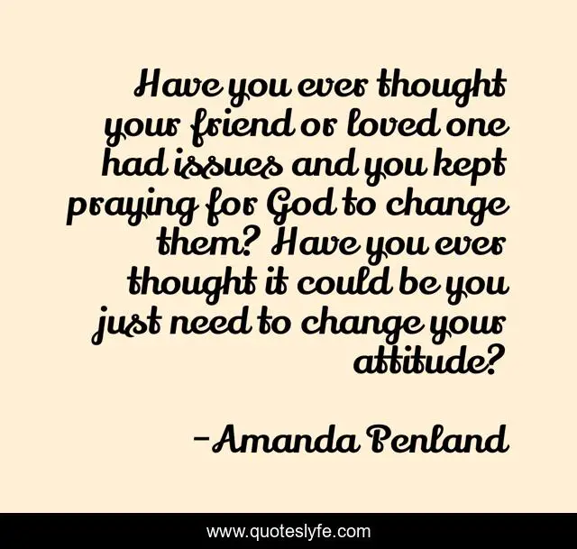 This page presents the quote "Have you ever thought your friend or loved one had issues and you kept praying for God to change them? Have you ever thought it could be you just need to change your attitude?". Author of this quote is Amanda Penland. This quote is about life-lesson, behaviour, attitude, life-experience,.