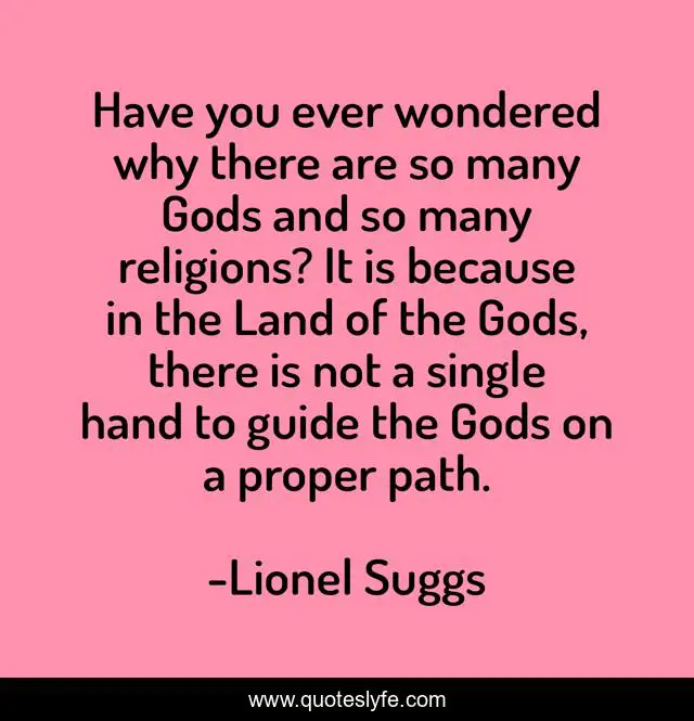This page presents the quote "Have you ever wondered why there are so many Gods and so many religions? It is because in the Land of the Gods, there is not a single hand to guide the Gods on a proper path.". Author of this quote is Lionel Suggs. This quote is about atheism, god, guidance,.