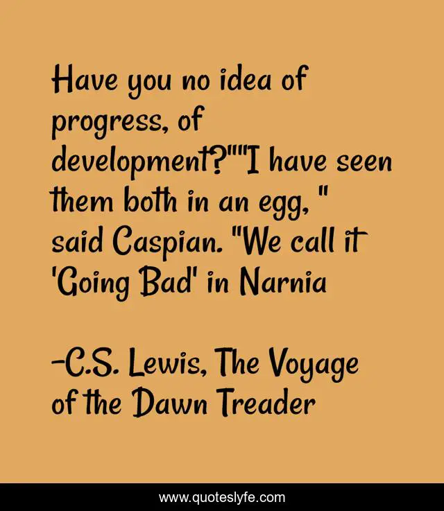 This page presents the quote "Have you no idea of progress, of development?""I have seen them both in an egg, " said Caspian. "We call it 'Going Bad' in Narnia". Author of this quote is C.S. Lewis, The Voyage of the Dawn Treader. .