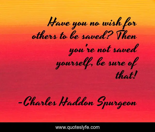 This page presents the quote "Have you no wish for others to be saved? Then you're not saved yourself, be sure of that!". Author of this quote is Charles Haddon Spurgeon. This quote is about christian, evangelism, share, charles-spurgeon, witness,.