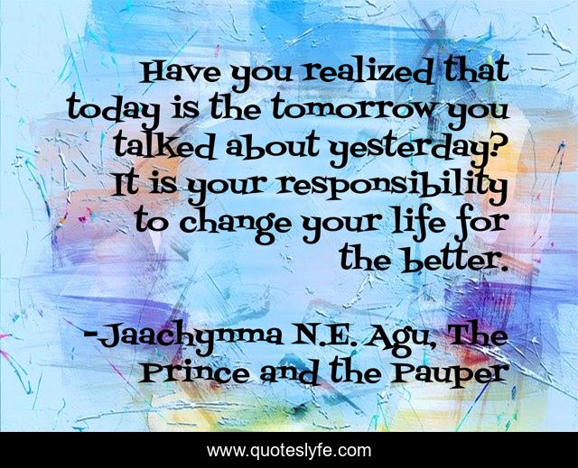 "Jaachynma N.E. Agu, The Prince and the Pauper Quotes." Quoteslyfe.com, 2026. Thu. 19 Mar. 2026. <https://www.quoteslyfe.com/quote/Have-you-realized-that-today-is-the-28635>.