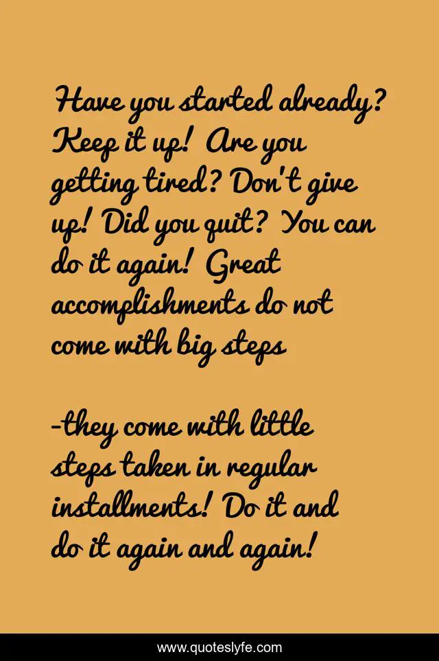 "they come with little steps taken in regular installments! Do it and do it again and again! Quotes." Quoteslyfe.com, 2025. Sat. 06 Dec. 2025. <https://www.quoteslyfe.com/quote/Have-you-started-already-Keep-it-up-129800>.
