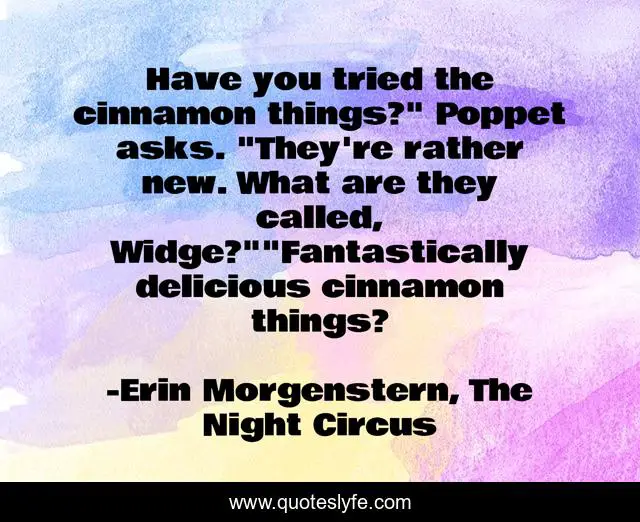 This page presents the quote "Have you tried the cinnamon things?" Poppet asks. "They're rather new. What are they called, Widge?""Fantastically delicious cinnamon things?". Author of this quote is Erin Morgenstern, The Night Circus. .