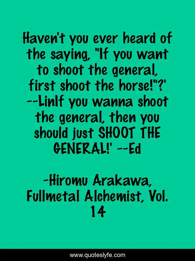 This page presents the quote "Haven't you ever heard of the saying, "If you want to shoot the general, first shoot the horse!"?' --LinIf you wanna shoot the general, then you should just SHOOT THE GENERAL!' --Ed". Author of this quote is Hiromu Arakawa, Fullmetal Alchemist, Vol. 14. This quote is about funny, comedy, humor, full-metal-alchemist,.