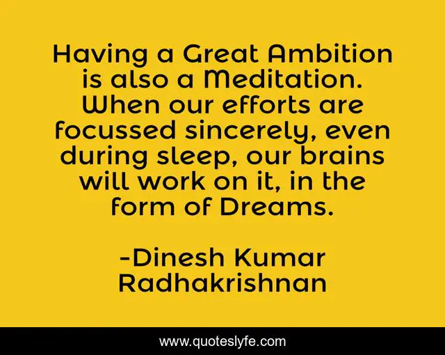 This page presents the quote "Having a Great Ambition is also a Meditation. When our efforts are focussed sincerely, even during sleep, our brains will work on it, in the form of Dreams.". Author of this quote is Dinesh Kumar Radhakrishnan. This quote is about visionary, vision, ambition,.