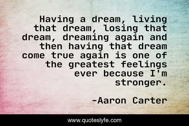This page presents the quote "Having a dream, living that dream, losing that dream, dreaming again and then having that dream come true again is one of the greatest feelings ever because I'm stronger.". Author of this quote is Aaron Carter. This quote is about loss, dreams, happiness, hope,.