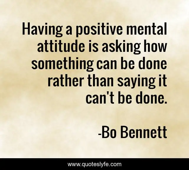 This page presents the quote "Having a positive mental attitude is asking how something can be done rather than saying it can't be done.". Author of this quote is Bo Bennett. This quote is about positive, confidence, done, saying,.