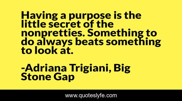 This page presents the quote "Having a purpose is the little secret of the nonpretties. Something to do always beats something to look at.". Author of this quote is Adriana Trigiani, Big Stone Gap. This quote is about trigiani, self-image, beauty, conceit, southern-lit, pretty, self-confidence,.