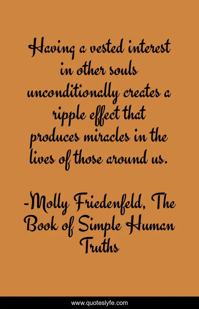 This page presents the quote "Having a vested interest in other souls unconditionally creates a ripple effect that produces miracles in the lives of those around us.". Author of this quote is Molly Friedenfeld, The Book of Simple Human Truths. This quote is about miracles, ripple-effect, love, unconditional-love, compassion, joy, peace, inspirational, making-a-difference,.