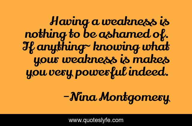 This page presents the quote "Having a weakness is nothing to be ashamed of. If anything~ knowing what your weakness is makes you very powerful indeed.". Author of this quote is Nina Montgomery. .