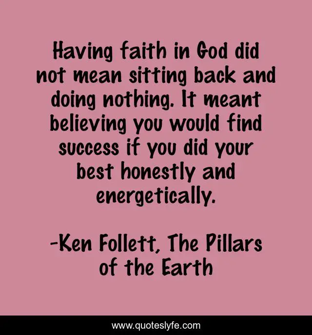 This page presents the quote "Having faith in God did not mean sitting back and doing nothing. It meant believing you would find success if you did your best honestly and energetically.". Author of this quote is Ken Follett, The Pillars of the Earth. .
