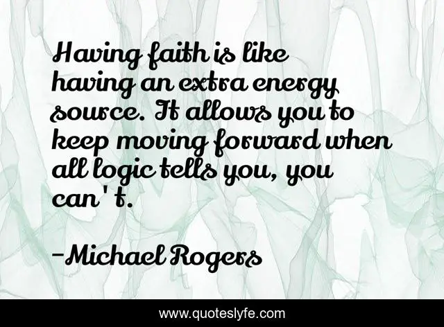 This page presents the quote "Having faith is like having an extra energy source. It allows you to keep moving forward when all logic tells you, you can't.". Author of this quote is Michael Rogers. This quote is about faith, rostical, determination,.
