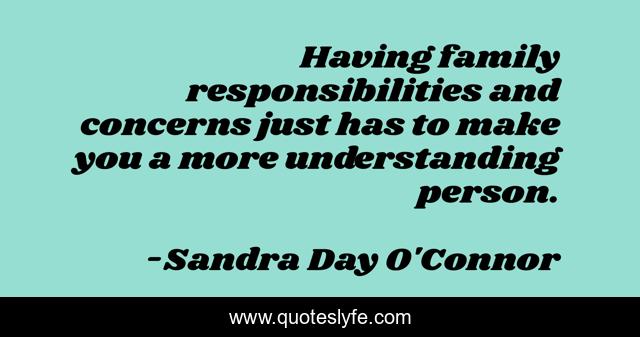 This page presents the quote "Having family responsibilities and concerns just has to make you a more understanding person.". Author of this quote is Sandra Day O'Connor. This quote is about person, understanding,.