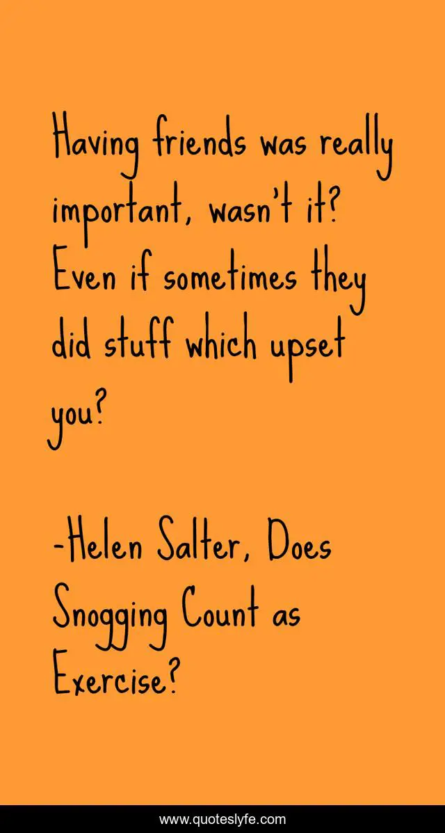 This page presents the quote "Having friends was really important, wasn't it? Even if sometimes they did stuff which upset you?". Author of this quote is Helen Salter, Does Snogging Count as Exercise?. This quote is about friendship, helen-salter, thatsaquote,.