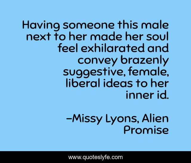 This page presents the quote "Having someone this male next to her made her soul feel exhilarated and convey brazenly suggestive, female, liberal ideas to her inner id.". Author of this quote is Missy Lyons, Alien Promise. This quote is about exhilarated, lust, attraction, female, male, happy,.