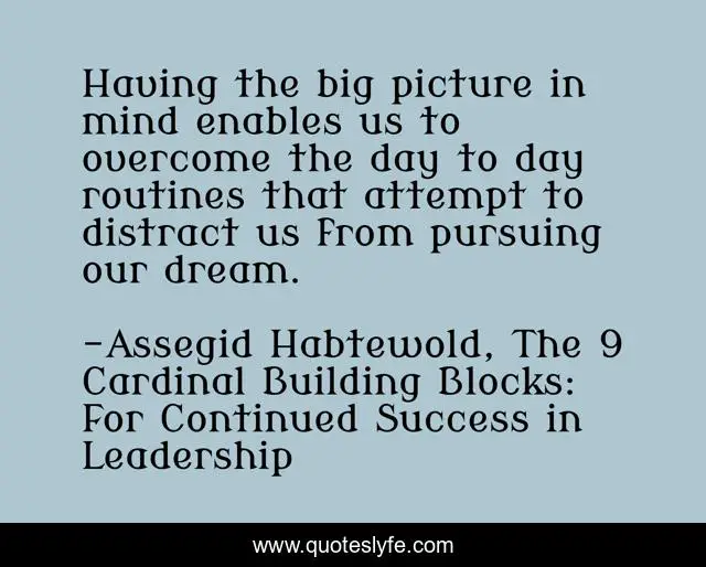 This page presents the quote "Having the big picture in mind enables us to overcome the day to day routines that attempt to distract us from pursuing our dream.". Author of this quote is Assegid Habtewold, The 9 Cardinal Building Blocks: For Continued Success in Leadership. This quote is about big-picture, dream, overcome-routines,.