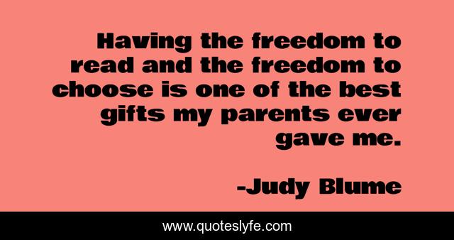 This page presents the quote "Having the freedom to read and the freedom to choose is one of the best gifts my parents ever gave me.". Author of this quote is Judy Blume. This quote is about intellectual-freedom, ideas, books, censorship, banned-books, freedom-to-read, banned-books-week,.