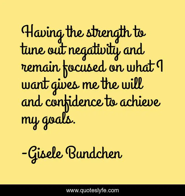 This page presents the quote "Having the strength to tune out negativity and remain focused on what I want gives me the will and confidence to achieve my goals.". Author of this quote is Gisele Bundchen. This quote is about me, confidence, goals,.
