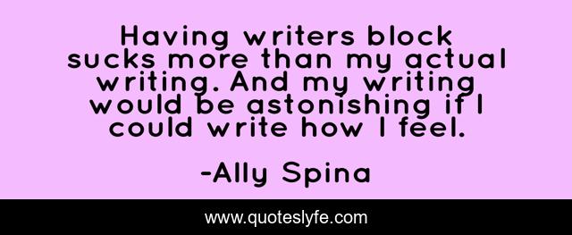 This page presents the quote "Having writers block sucks more than my actual writing. And my writing would be astonishing if I could write how I feel.". Author of this quote is Ally Spina. This quote is about writersblock, humor, feelings,.