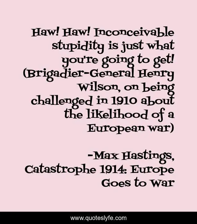 This page presents the quote "Haw! Haw! Inconceivable stupidity is just what you're going to get! (Brigadier-General Henry Wilson, on being challenged in 1910 about the likelihood of a European war)". Author of this quote is Max Hastings, Catastrophe 1914: Europe Goes to War. This quote is about foresight, irony, historical, history,.