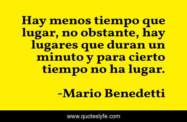 This page presents the quote "Hay menos tiempo que lugar, no obstante, hay lugares que duran un minuto y para cierto tiempo no ha lugar.". Author of this quote is Mario Benedetti. .