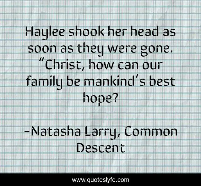This page presents the quote "Haylee shook her head as soon as they were gone. “Christ, how can our family be mankind’s best hope?". Author of this quote is Natasha Larry, Common Descent. This quote is about darwin-s-children, humor, ya, book-series, paranormal, haylee-mitchell,.