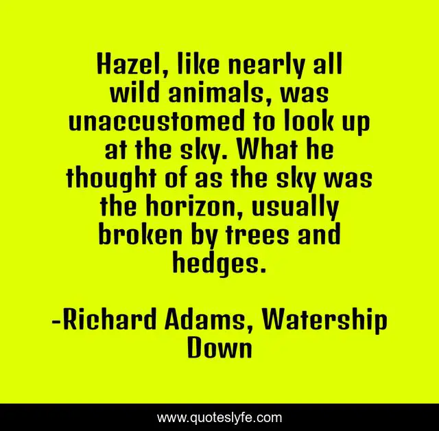 This page presents the quote "Hazel, like nearly all wild animals, was unaccustomed to look up at the sky. What he thought of as the sky was the horizon, usually broken by trees and hedges.". Author of this quote is Richard Adams, Watership Down. .