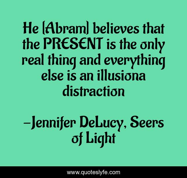 This page presents the quote "He [Abram] believes that the PRESENT is the only real thing and everything else is an illusiona distraction". Author of this quote is Jennifer DeLucy, Seers of Light. This quote is about enthusiasm, life, inspirational, present, distraction,.