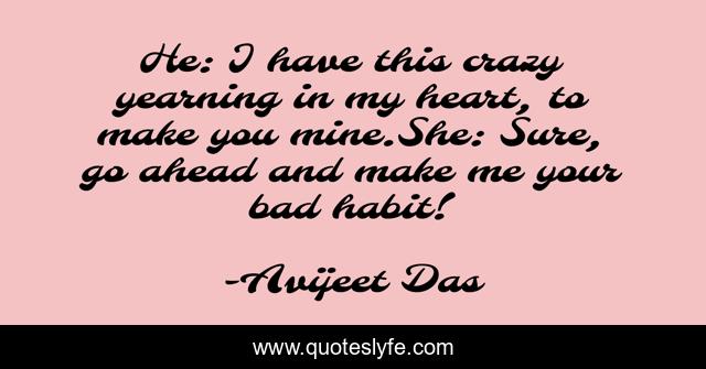This page presents the quote "He: I have this crazy yearning in my heart, to make you mine.She: Sure, go ahead and make me your bad habit!". Author of this quote is Avijeet Das. This quote is about desire, badhabit, passionatelove, yearning, passion, youandme,.