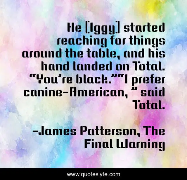 This page presents the quote "He [Iggy] started reaching for things around the table, and his hand landed on Total. “You’re black.”“I prefer canine-American, ” said Total.". Author of this quote is James Patterson, The Final Warning. .
