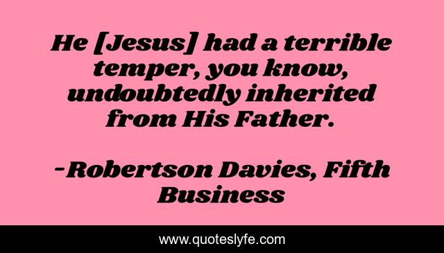 This page presents the quote "He [Jesus] had a terrible temper, you know, undoubtedly inherited from His Father.". Author of this quote is Robertson Davies, Fifth Business. This quote is about temper, jesus,.