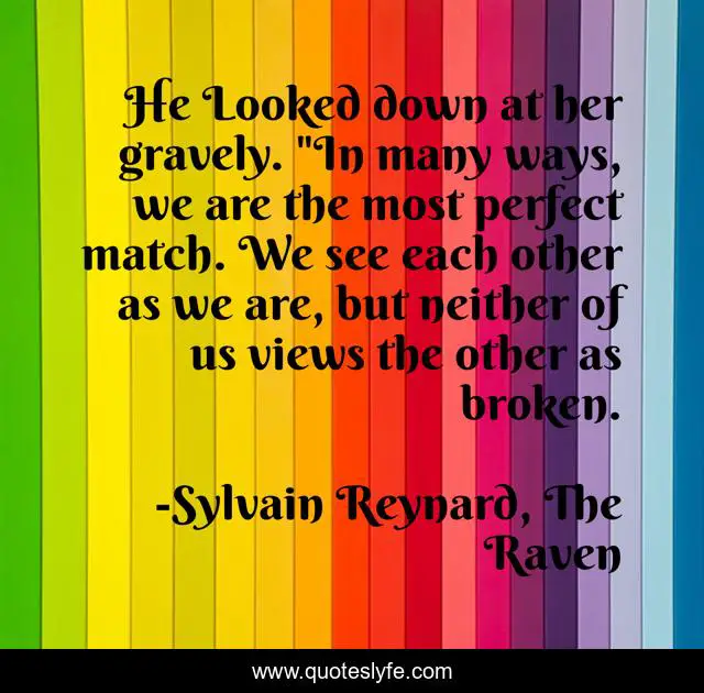 This page presents the quote "He Looked down at her gravely. "In many ways, we are the most perfect match. We see each other as we are, but neither of us views the other as broken.". Author of this quote is Sylvain Reynard, The Raven. .