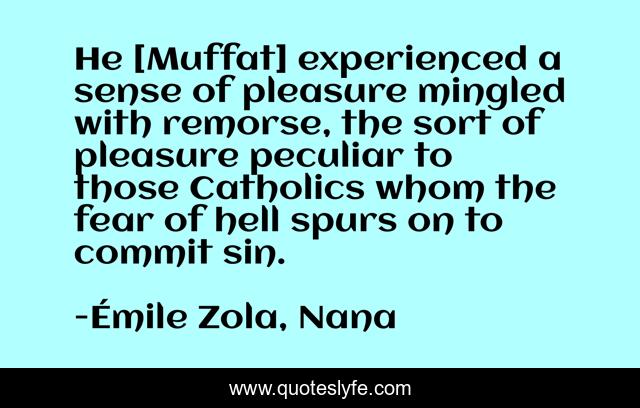 This page presents the quote "He [Muffat] experienced a sense of pleasure mingled with remorse, the sort of pleasure peculiar to those Catholics whom the fear of hell spurs on to commit sin.". Author of this quote is Émile Zola, Nana. This quote is about pleasure, guilt, sin,.